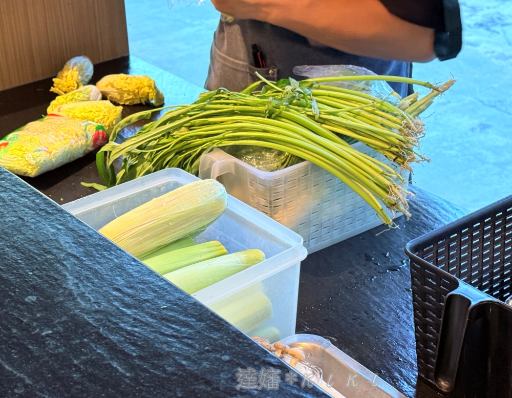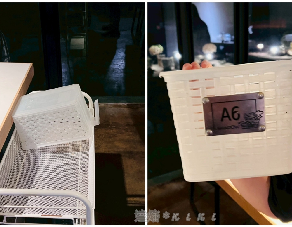 每桌都有桌號的小提籃,把要吃的蔬菜放進去再拿給服務人員清洗。還有推車可以用。